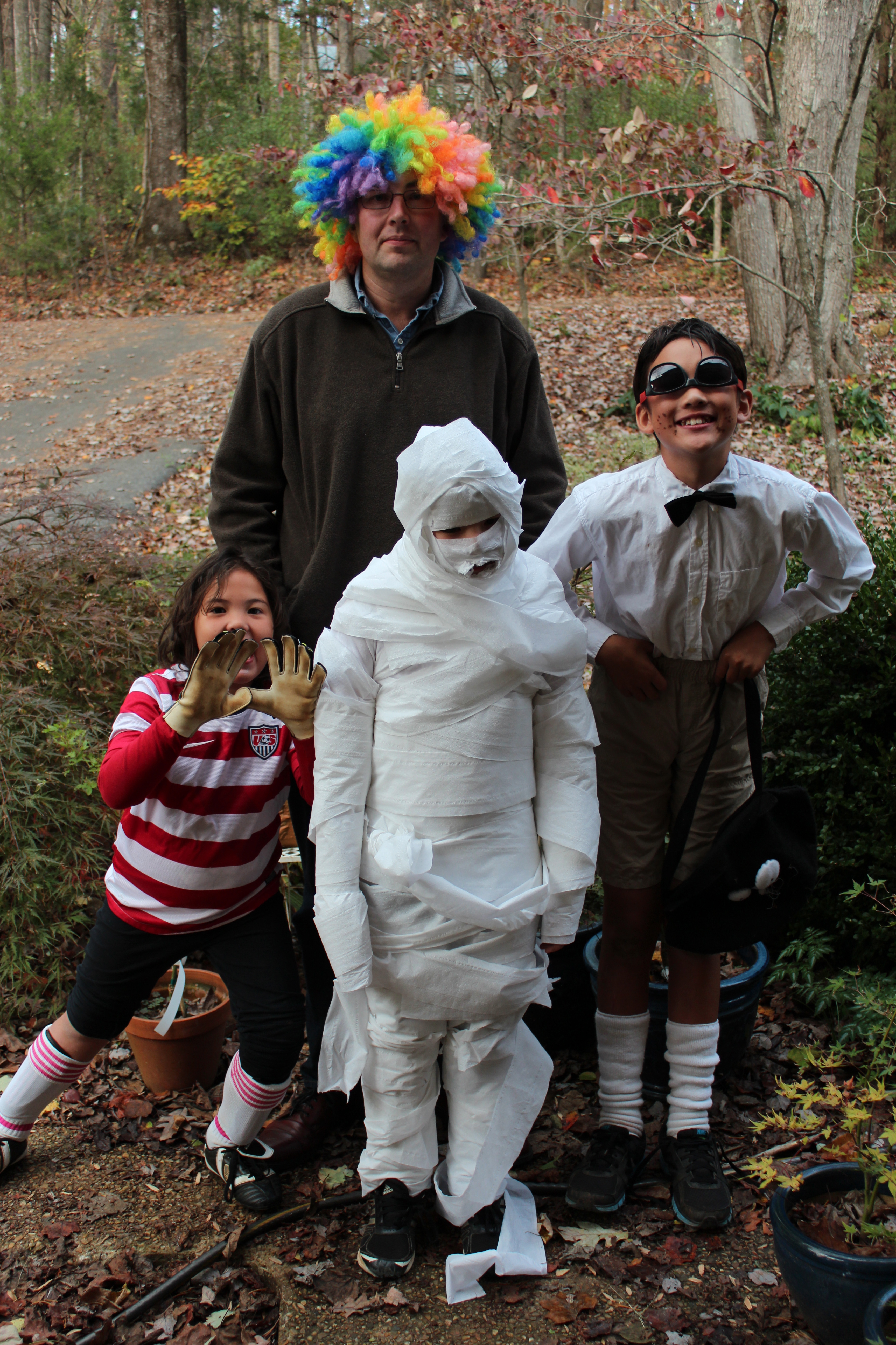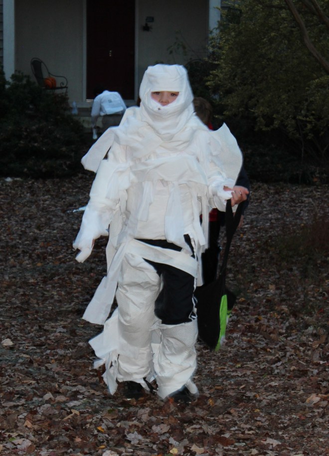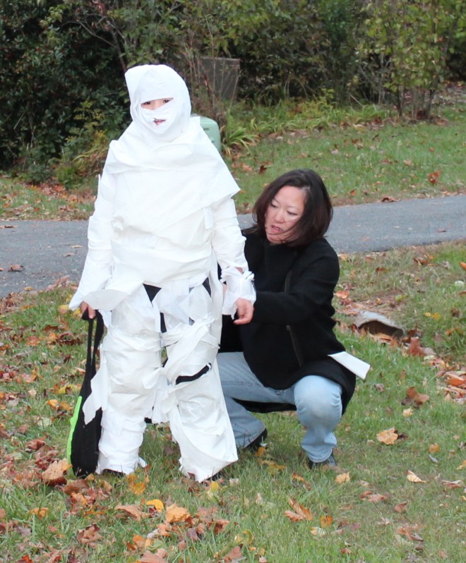 This is what happens when your kid cannot figure out what he wants to be for Halloween. A very frazzled mommy has to come up with something in the fifteen minutes between getting home from work and leaving for trick-or-treating. Let me tell you, it’s not pretty…and I’m not talking about that crazy ‘do my husband was sporting, although I did keep having to quickly avert my gaze every time my eyes inadvertently lit upon him.