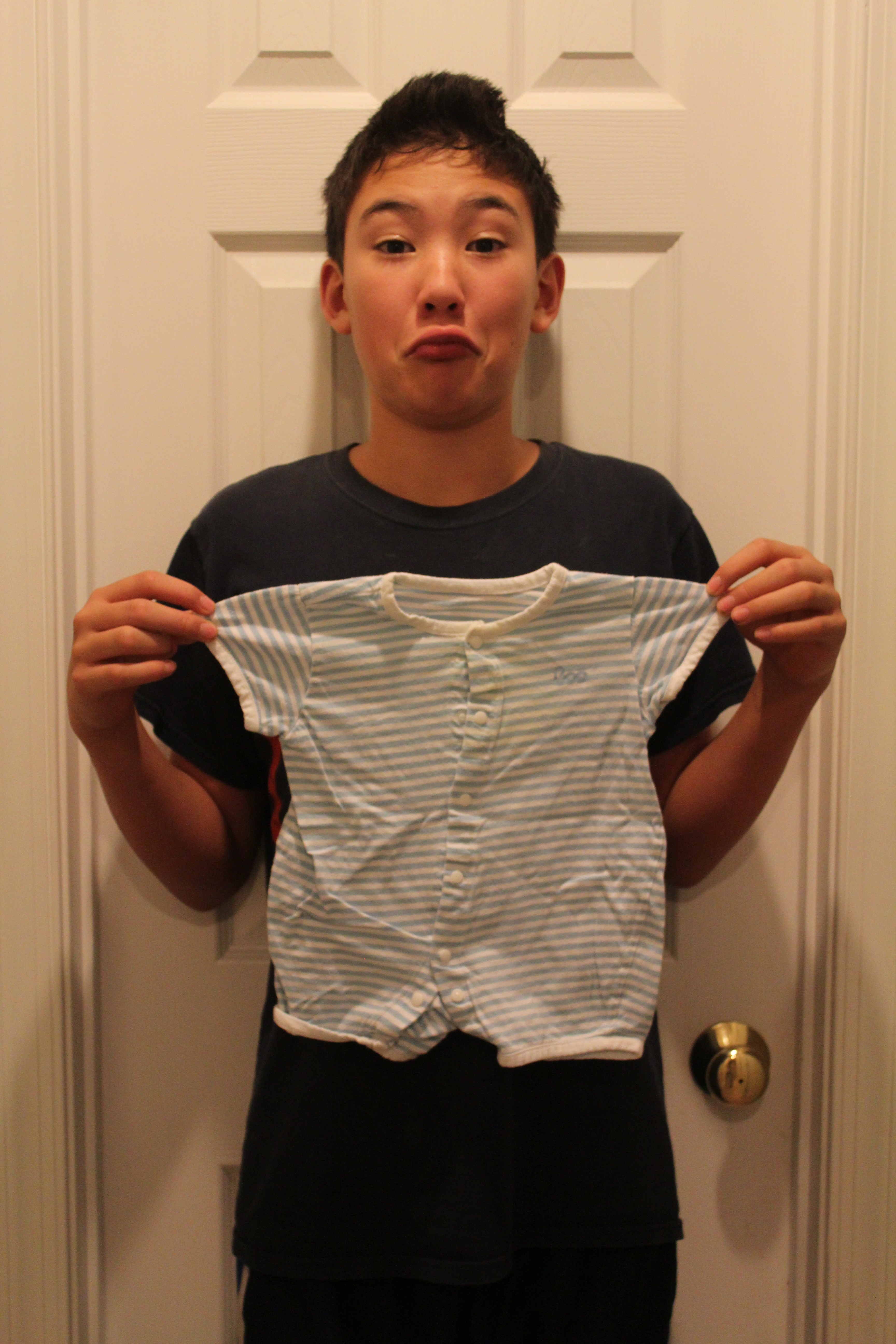 Nicholas holding up one of his baby outfits.