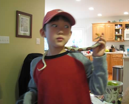The summer before we moved, my husband Colin took a scouting trip to find possible places for us to live. He called to tell me he had found the perfect house. The big selling point for him was that the family who was renting out their house had an albino corn snake and they offered to let us “snake sit” her. My son, who was eight at the time, was obsessed with snakes. For his birthday that year we had gotten him a snake puppet, rubber snakes, and books about snakes. (See photo at left). He was unhappy about being uprooted from his school and friends, and Colin thought the snake might be a good way to get him excited about the move.