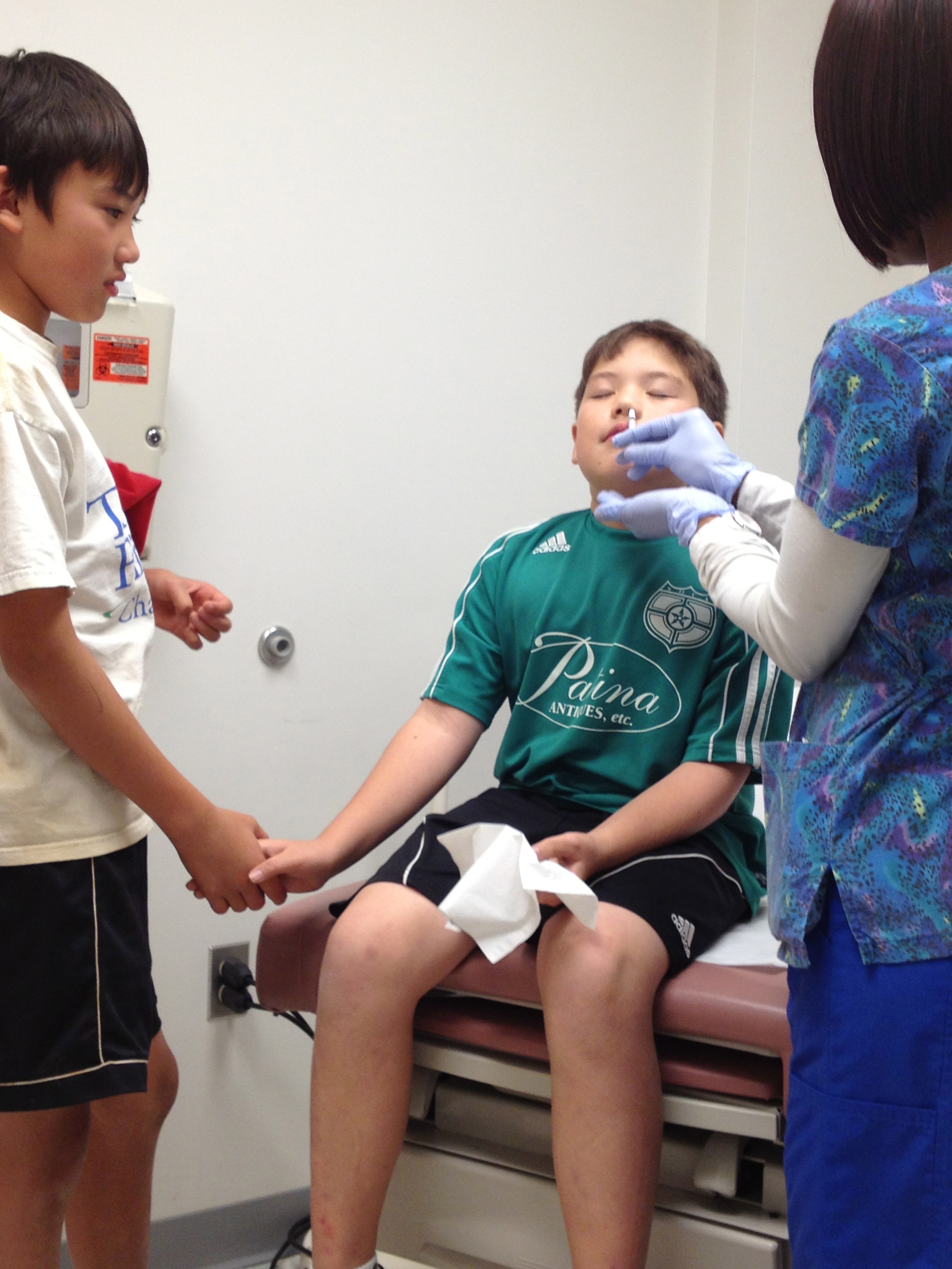 This year, for the first time ever, the nurse offered the boys the choice of the shot or the FluMist. Twelve year old Nicholas played it cool. He explained to the nurse that while he would be totally o.k. with getting a shot, it might be interesting just this once to see what the FluMist would be like. He even offered to go first.